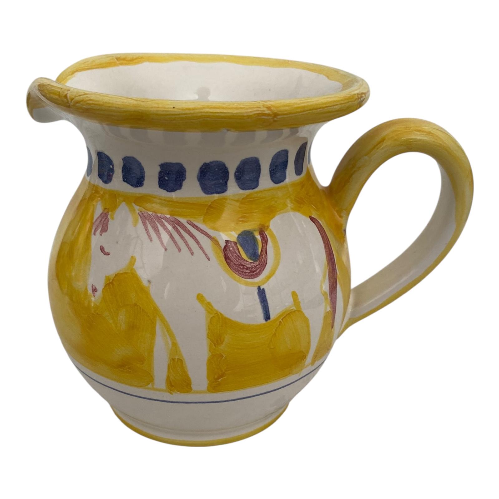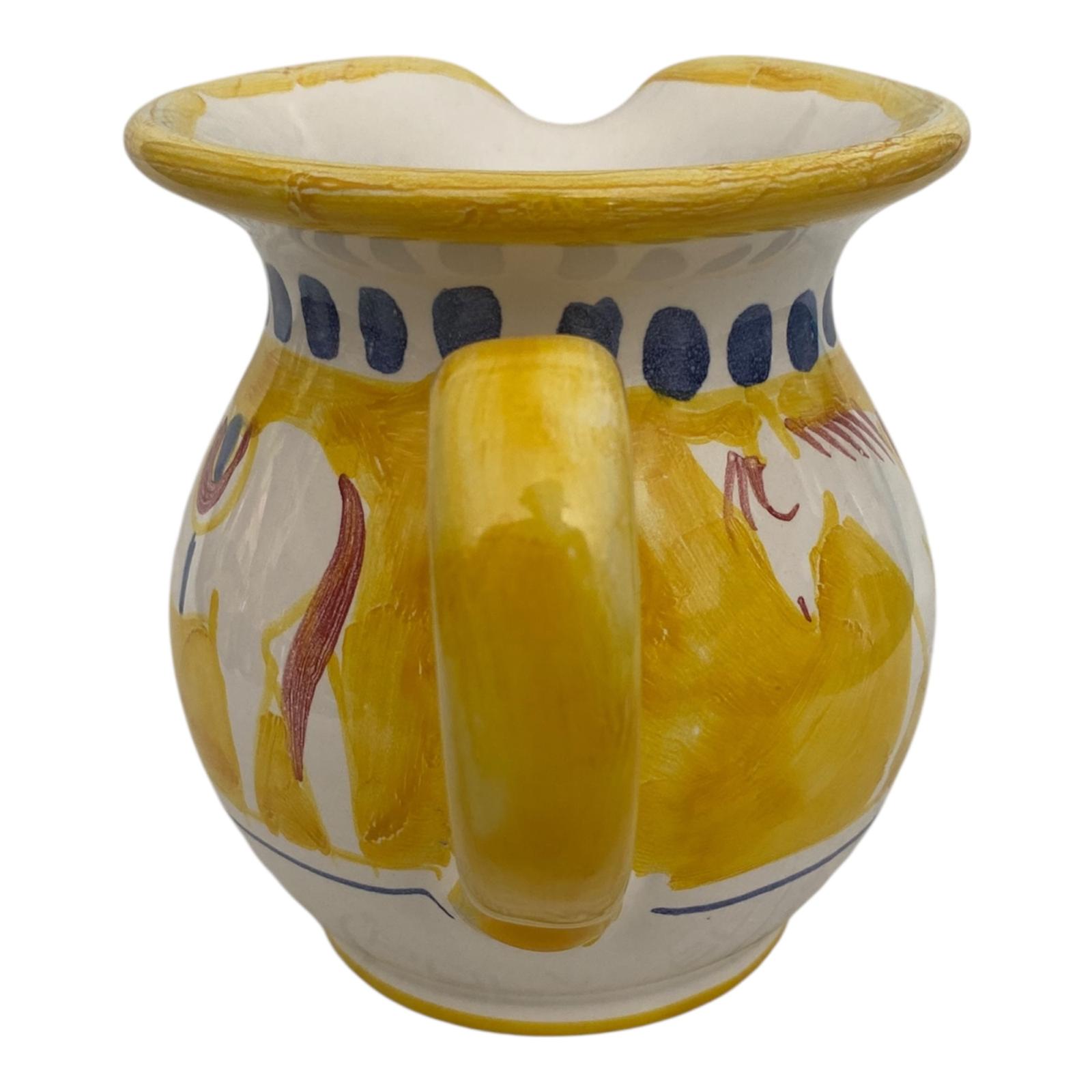 I colori vivaci e i decori tradizionali evocano i paesaggi, i profumi e l’atmosfera calda del Sud Italia, rendendo ogni brocca un pezzo unico. Perfetta per servire acqua, vino, succhi o da utilizzare come elemento decorativo, unisce funzionalità e bellezza artigianale in un formato più compatto.