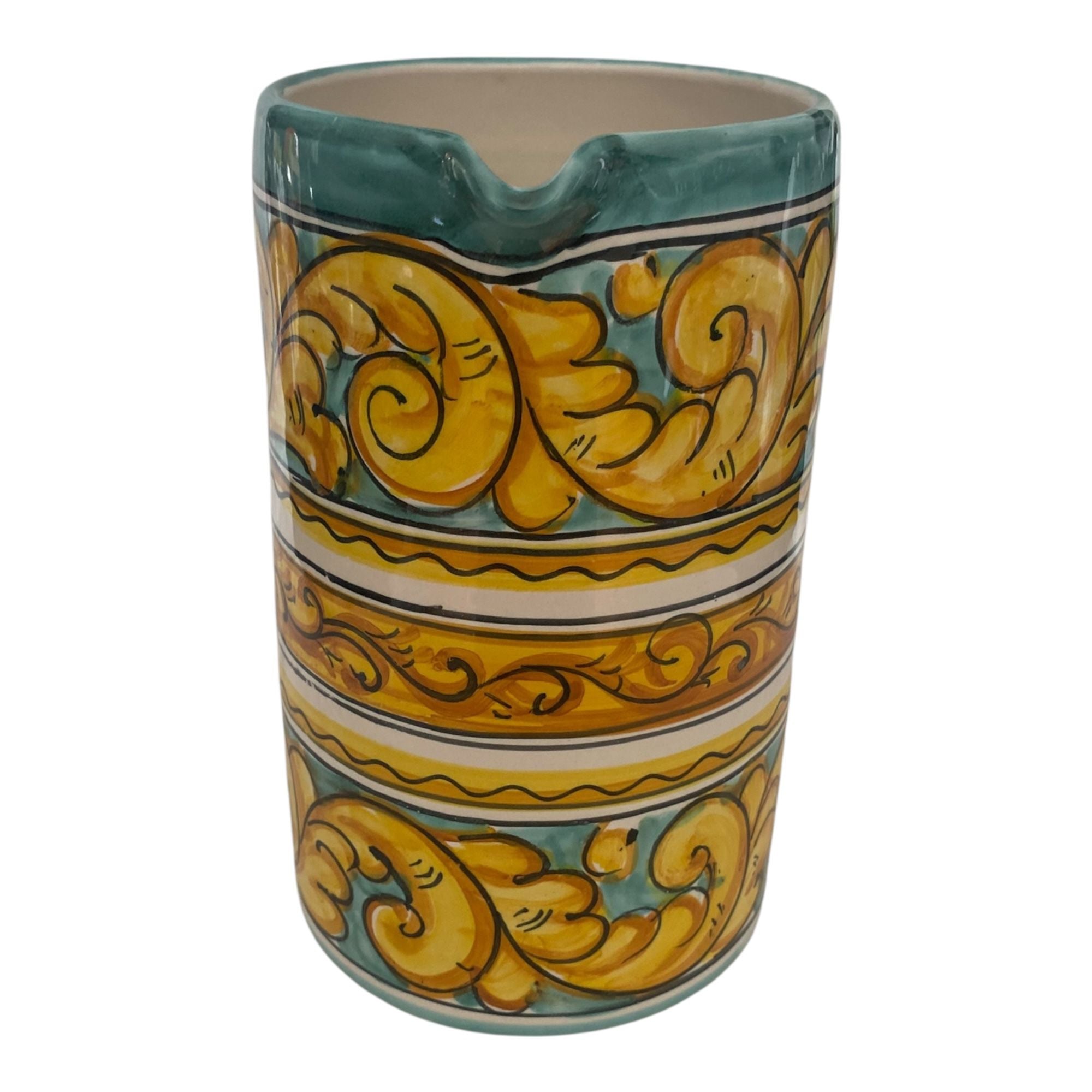Il decoro vivace e i colori brillanti richiamano i paesaggi e i profumi tipici del Sud Italia, rendendo ogni pezzo unico e ricco di carattere. Perfetta per servire acqua, vino, succhi o per essere esposta come elemento d’arredo, unisce funzionalità e bellezza artigianale.