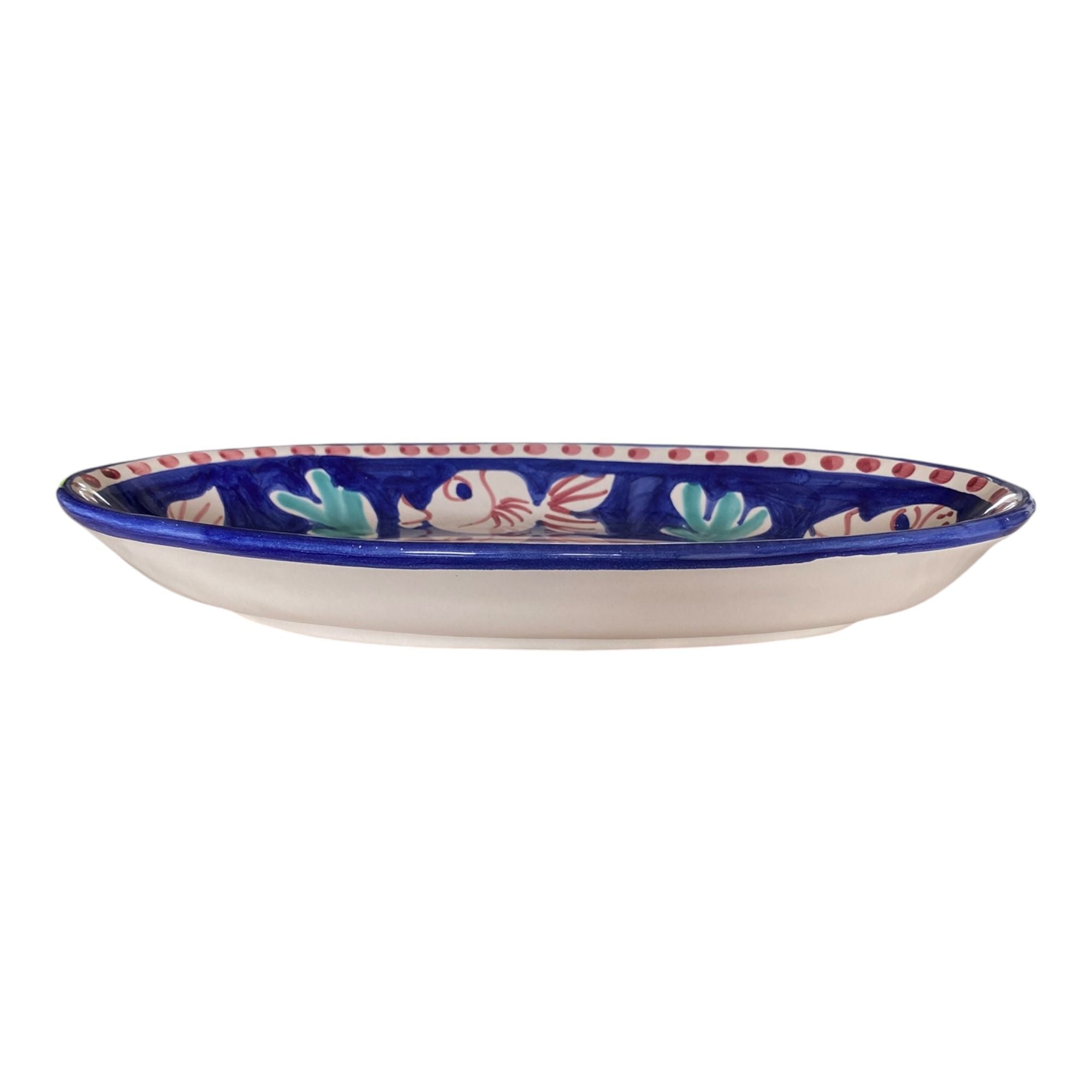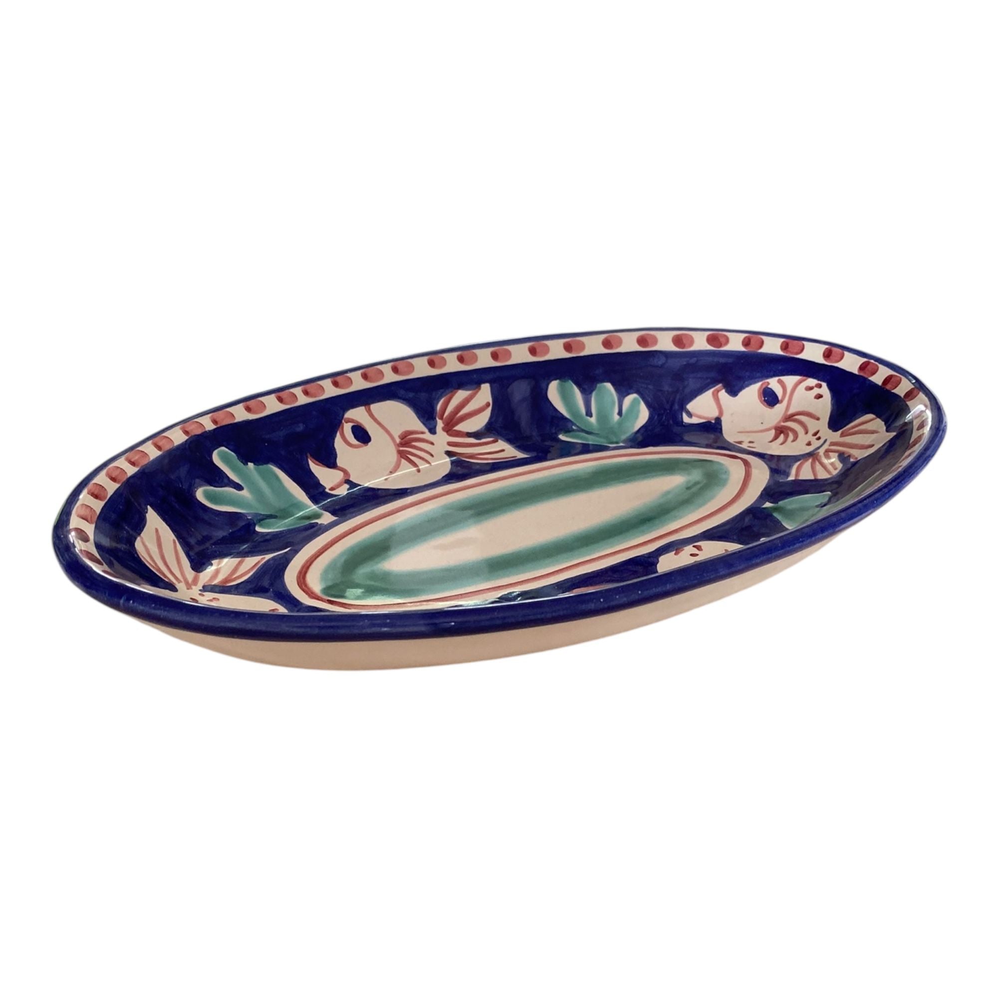 Un autentico capolavoro dell’artigianato italiano. Questo piatto ovale da 30 cm è realizzato in pregiata ceramica di Vietri e decorato a mano secondo i motivi classici della Costiera Amalfitana. Ogni pezzo è unico, frutto della sapiente maestria di artigiani locali che tramandano la tradizione da generazioni.